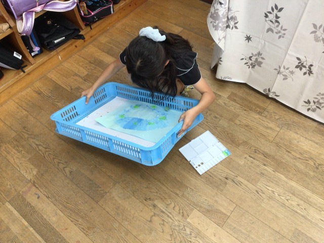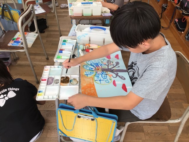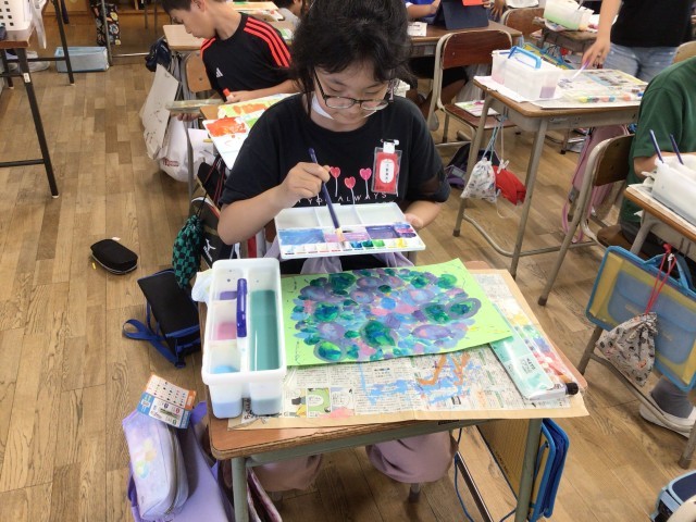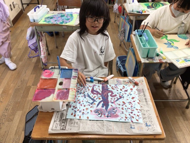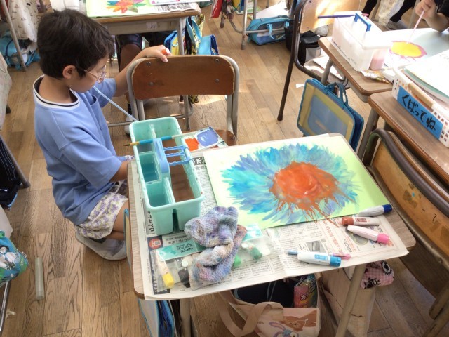 前回の授業で学習した絵の具の技法をつかって、想像上の花を描きました。絵の具をストローで広げたり、ビー玉につけて転がしたりしながら、自分なりの花を表現しました。素敵な花がたくさん咲きました💐