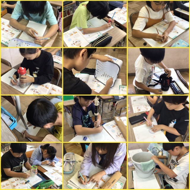 算数では、「円と球」の学習に入ったクラスもあります。1組では、コンパスを使わずに身近にあるもので丸をかくお題に楽しく取り組みました。