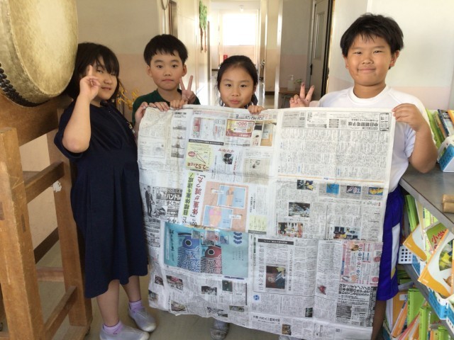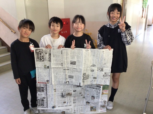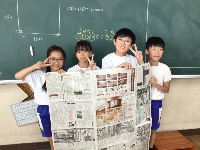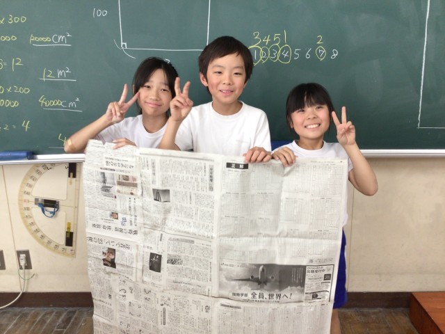 算数の面積の学習で1平方メートルを新聞で作りました。どれだけの大きさか、実物を見て実感できました。