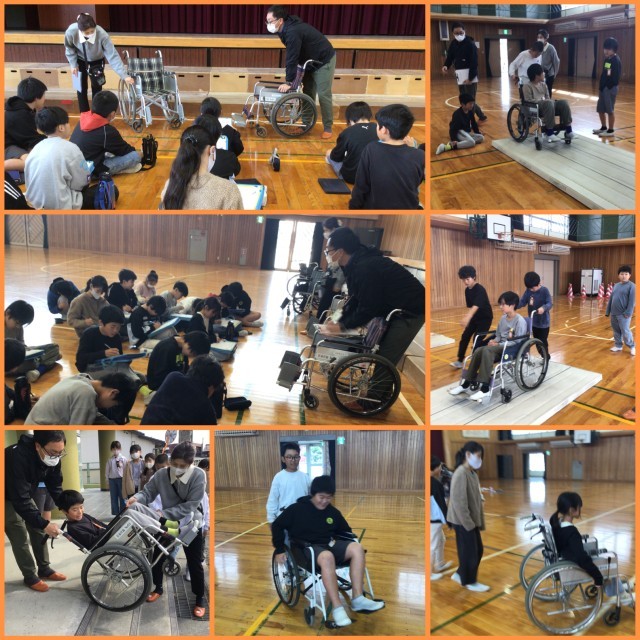 少しの段差でも、車いすで移動することは難しいこと、介護する時は乗っている人とコミュニケーションをしっかりとることなどを学ぶことができました。いつもより、思いやりの気持ちが大切なことに気づいた子どもたちでした。