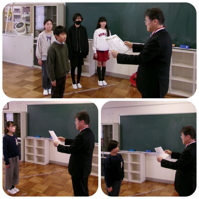表彰では、税に関する習字での入選、読書感想文と読書感想画でそれぞれ学年代表に選ばれた児童が表彰を受けました。