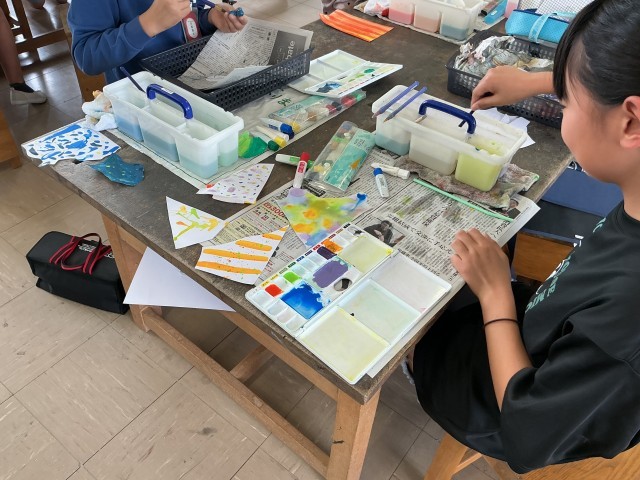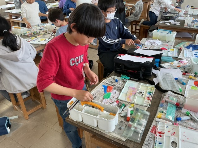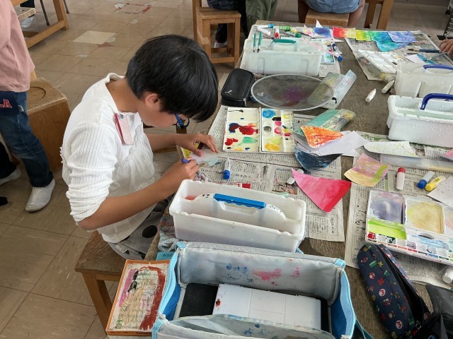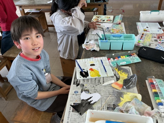 3組は図工「心の模様」の単元で絵の具の技法を使って今の自分の感情を表現しました。今の自分の感情にはどの色が合うかな?どの技法が合うかな?と考えながら作品を描きました。5年生最初の図工の単元、子供達はとても楽しそうな様子で取り組んでいました。