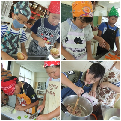 なす、オクラ、ミニトマト、ピーマンなど6組の畑で作った夏野菜をたっぷり入れました。みんなで作ったカレーはとてもおいしくて、何回もおかわりしていました。