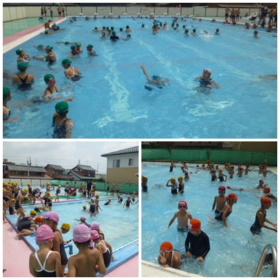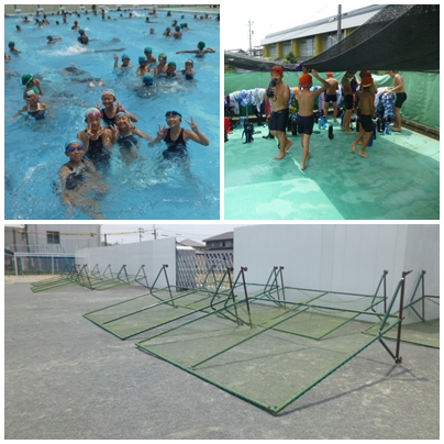 3日間、異常高温のため中止を余儀なくされていたプール開放を昨日(26日)から実施しています。昨日、今日といずれも300名ほどの子どもたちがプールで水しぶきをあげています。休憩時間には水筒のお茶を飲んで水分補給をしたり、寒冷紗をかけて日陰を作ったり、熱中症対策にも万全を期しています。
