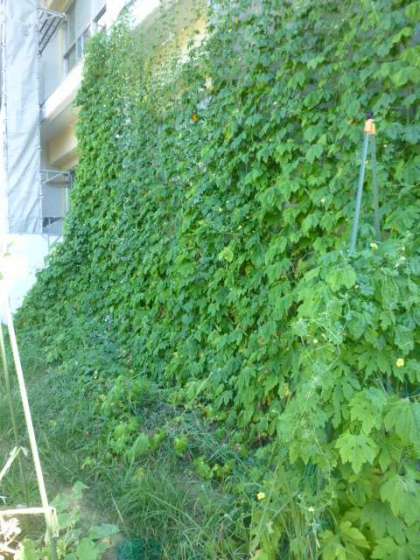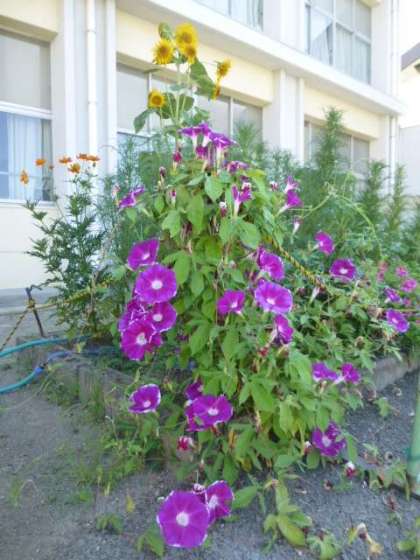 北館前の花壇では、アサガオやヒマワリが暑さに負けず花を咲かせています。南館南側では、ゴーヤが緑のカーテンをつくっています。