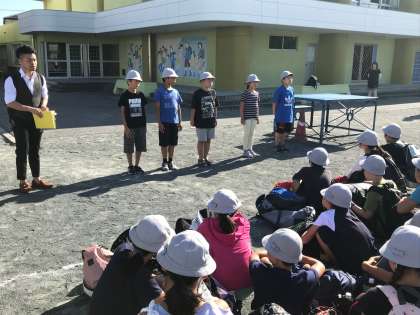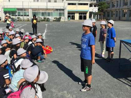 参加者全員の出席と健康が確認されました。実行委員の司会で出発式を行いました。実行委員のみんなは、進行順やあいさつ内容をしっかり覚えて堂々と話していました。野外学習にかける心意気が感じられました。