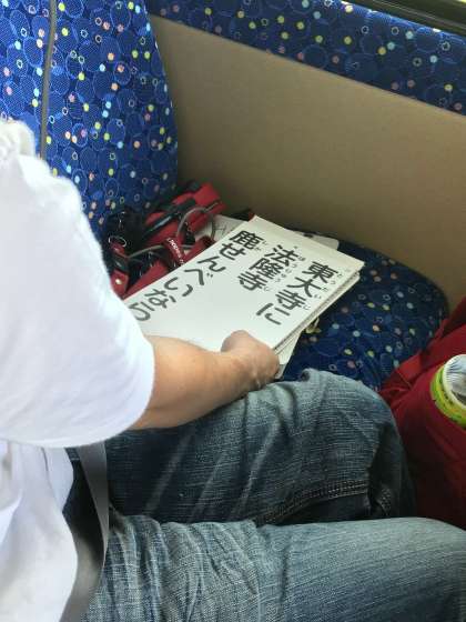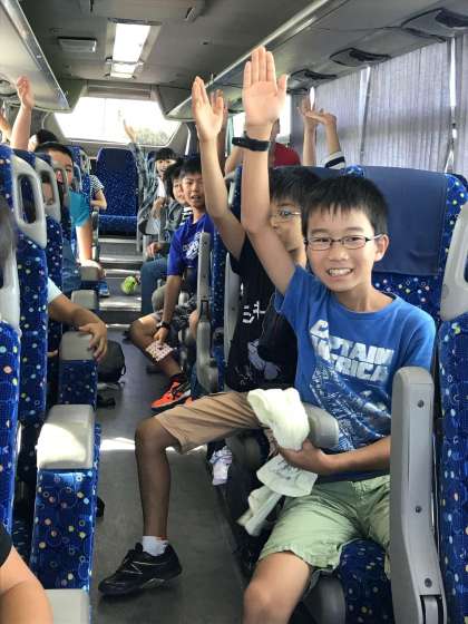バスは、愛岐大橋を渡り終え、岐阜県に入りました。1号車の車内ではバスレクが始まりました。スリーヒントから都道府県名を当てるクイズです。よく手が上がっています。社会の勉強の成果ですね。