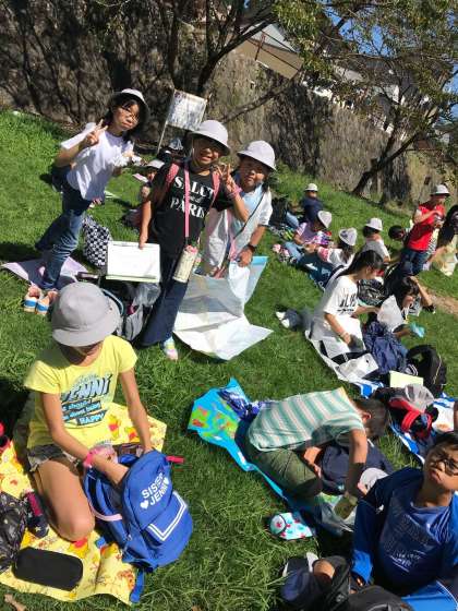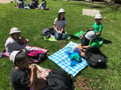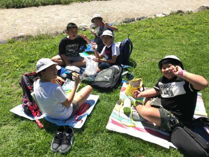 中河原公園は、清流吉田川のほとり。川では鮎を釣る人が竿を振っています。昼食風景をお送りします。