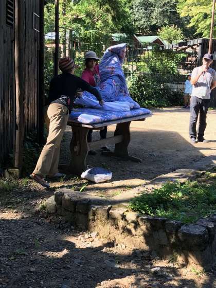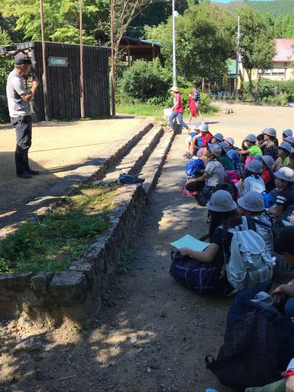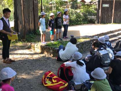 栗の木広場に集合して、入園式を行いました。自然園の方のお話を聞き、寝具の扱いについて説明を受けました。