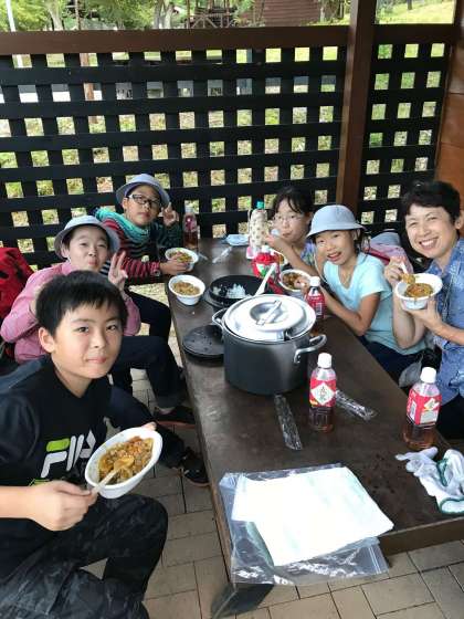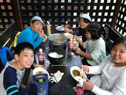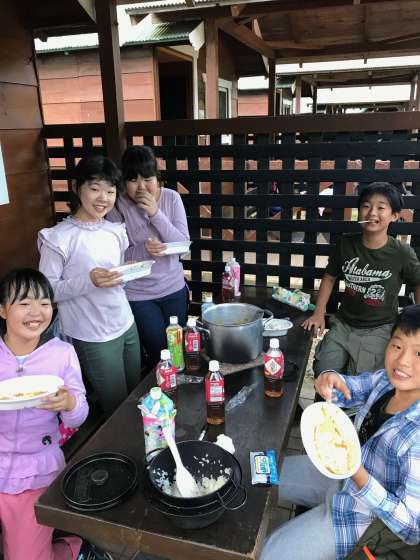 おいしくて、お皿空っぽの状態を自慢げに見せてくれる班もありました。余ったお米を他の班に食べてもらおうと、駆け回っている班もあります。