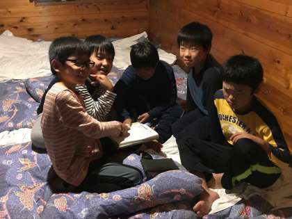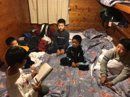 部屋長会が終わった後、バンガローを覗くと、早速部屋長さんが、同室の仲間に連絡事項を伝える姿が見られました。