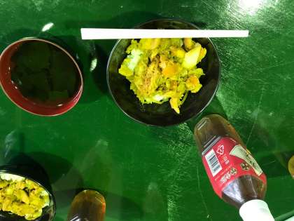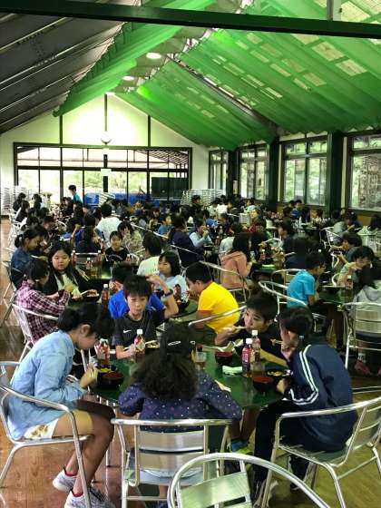 朝の諸活動を終え、朝食会場に入りました。献立は、鶏ちゃん丼です。