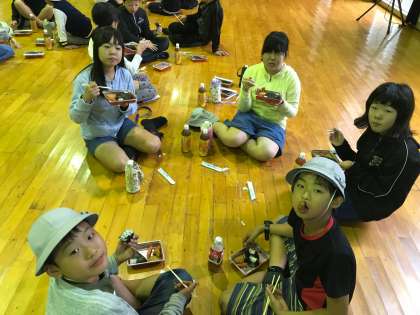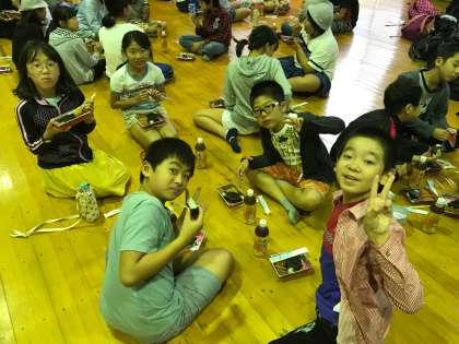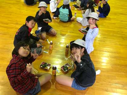 体験活動を終え、お昼のお弁当の時間です。お腹の中には、まだアマゴか五平餅が残っていますが、皆で食べると食欲も進むようです。