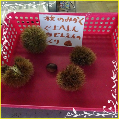 2年2組のロッカーに、栗がありました。昨日の野外学習への応援に行った際に、担任が拾ったものです。最近は本物の「いが」のついた栗を見ることが少なくなってきました。子どもたちは噂に聞く「くりのとげとげ」を物珍しそうに見ていました。