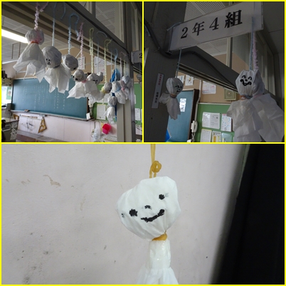 2年4組のある子がたくさんてるてるぼうずを作ってきてくれました。朝、早起きして作ったそうです。吊されているたくさんのてるてるぼうずに、明日の遠足の好天を祈る2年生でした。