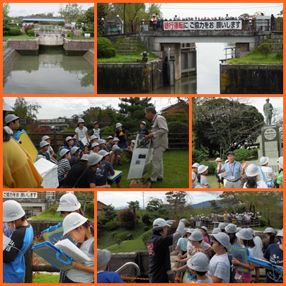 最後に向かったのは「船頭平閘門」です。昔、まだ船での輸送が盛んだったころ、木曽川と長良川を行き来するのに二つの川の水位が違ったため、その差を調整して行き来できるようにしたのが「船頭平閘門」です。今日は実際に門を開けて水位が上がったり下がったりする様子を見せていただきました。そのあと、ボランティアの方に案内をしていただきながら、デレーケさんの行った偉業について教えていただきました。