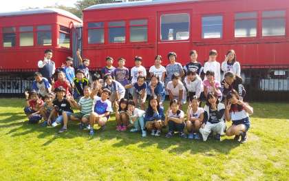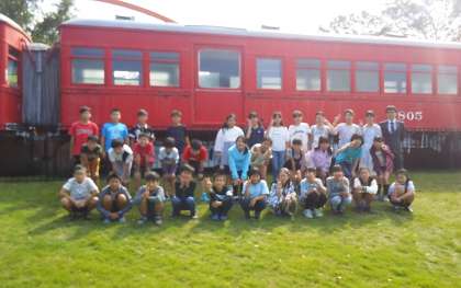 10月3日 門の横に保存されている電車の前で記念写真を撮りました。 1組、2組です。