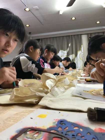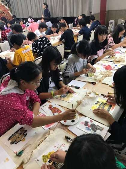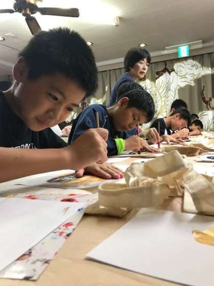 風呂上がりの後半グループが友禅染に取りかかりました。
