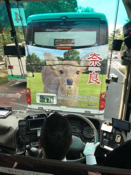ガイドさんから、車窓から眺められる奈良の名所を紹介してもらっています。