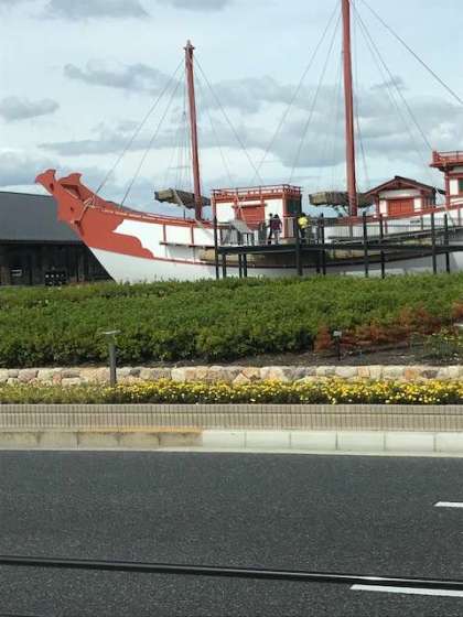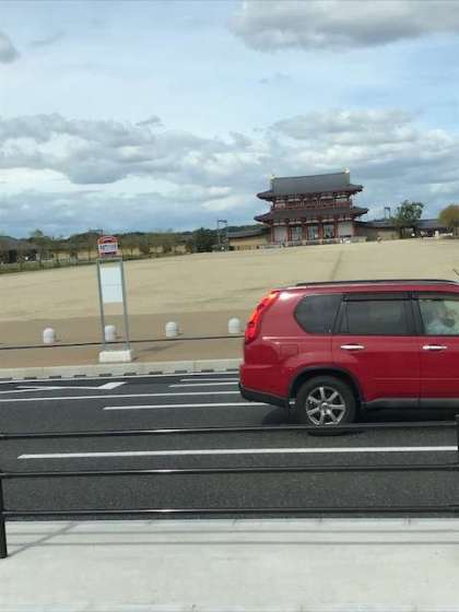 大仏建立の詔勅を出した聖武天皇の住まいの入り口である朱雀門、遣唐使船の実物大模型、写真はありませんが鑑真にまつわる唐招提寺、薬師寺の三重の塔などの話に耳を傾けています。