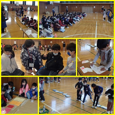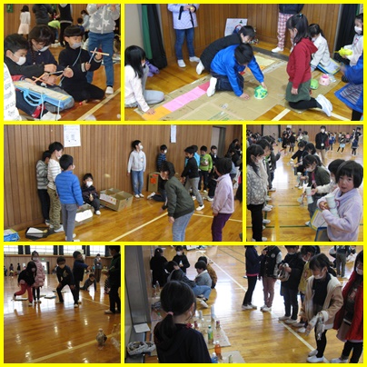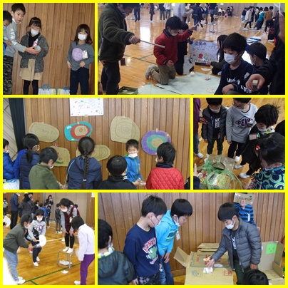 2年生が、手作りおもちゃの会に招待してくれました。はじめの会の後、各クラスで作ったブースを回り、説明を聞きました。2年生が、頑張って作ったおもちゃの遊び方を優しく教えてくれたので、みんな楽しそうに遊ぶことができました。