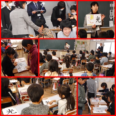 今日の4組の書写の授業では、水書で「光」という文字を書きました。「光」には毛筆で書く上で、横画、縦画、点、はね、はらい、まがりの6つのポイントがあります。子どもたちは、一人一人6つのポイントから特に気を付けたいことを『めあて』として設定し、アドバイスをする先生役とアドバイスをしてもらう子ども役に分かれ、練習し、交流していました。