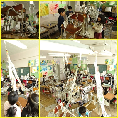 新聞紙をつないだり、吊したりして、さまざまなオブジェを作りました。