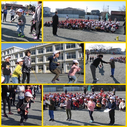 延期となっていた1年生の「クラスでジャンプ」大会を3年生と一緒に実施しました。校長先生が見守る中、3年生の立派な進行で、よい大会となりました。練習の甲斐あって、ほぼ全員が縄の中にしっかり入ることができ、担任一同驚いています。どのクラスも目標を達成でき、みんなうれしそうでした。