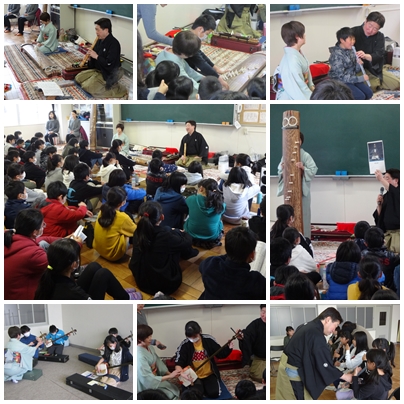 2〜4時間目に講師の先生をお招きして「いろはに邦楽」として邦楽の「いろは」を学習しました。まず、「春の海」の模範演奏や楽器や奏法の解説で邦楽の素晴らしさを実感した後、箏・三弦・尺八の3コースに分かれて演奏体験をしました。楽器をたくさん用意していただいたので、じっくり手ほどきを受けることができました。
