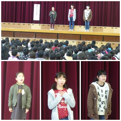 朝会の時間をに、高学年の「語りライブ」を行いました。始めに4年生代表が「だれがほんとうを」、続いて5年生代表が「あなたにありがとう」、最後に6年生代表が「いのち」の各詩を身振り手振りを交えて語りました。3人とも情感がこもっていて、全校のみんなが詩の世界にひたることができました。