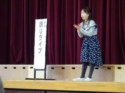 先週行われた高学年語りライブに引き続き、今日は低学年語りライブが行われました。3年生の代表となった児童は、身振り手振り・声の抑揚等工夫を凝らして、とても素敵な語りを披露してくれました。