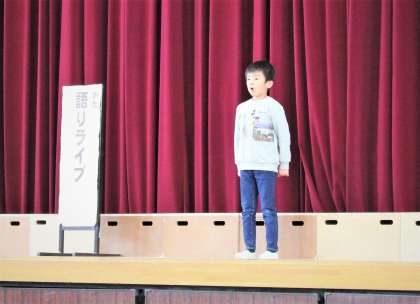 後期の語りライブがありました。1年生の代表は、各クラスでの予選を勝ち抜いた7名から選ばれた3組の男の子です。「おさるがふねをかきました」(まどみちお作)の詩を、1年生らしい元気な声で語っていました。全校からの拍手に加え、退場前には、学年全員からも拍手で労ってもらいました。来年度も語りの活動を通して、豊かな表現力を磨いてほしいと思います。