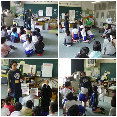 水曜日は5分間の「簡単掃除」で昼休みが長いので、子ども広場の部屋でコロボックルさんに読み聞かせをしていただいています。