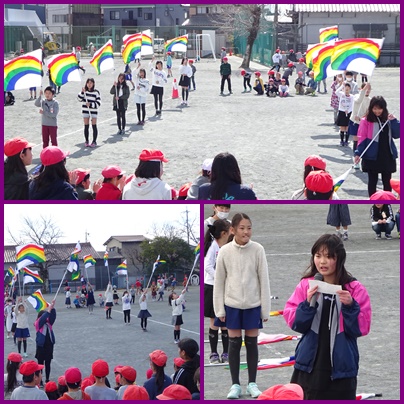 昼休みに、運動場でカラーガードクラブが発表会を行いました。