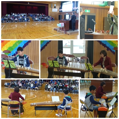 続いて、先日地域の方からいただいた箏の披露がありました。箏を習っている6年生の児童と音楽担当の先生が、「さくら」を演奏しました。