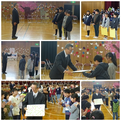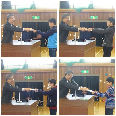 その後、6年間一日も休まずに登校した4人の児童に「皆勤賞」を渡しました。1年生から6年生まで、1200日あまり、無欠席というのはすばらしいことです。