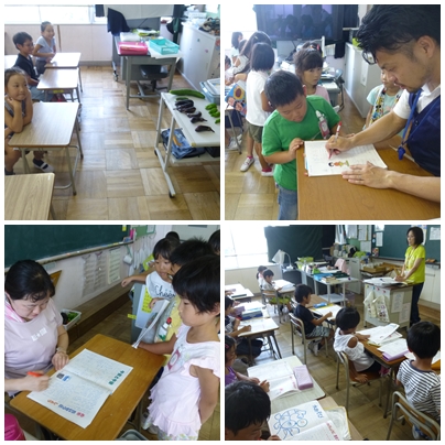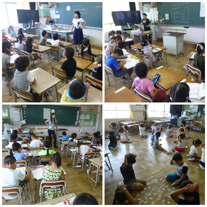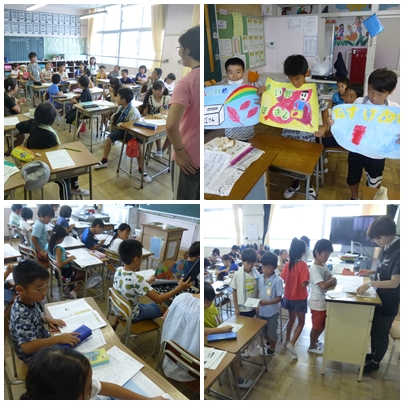 その後は、エアコンの効いた教室での学級活動です。日誌の答え合わせをしたり、応募作品を提出したりしました。かるたをしたり、夏休み10日間のできごとを発表したりしている学級もありました。(全学級の様子を写真で紹介します。まずは低学年から)