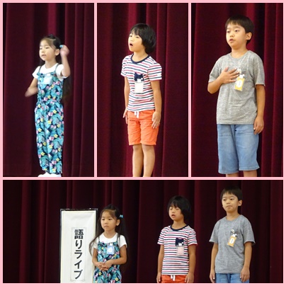 今朝の朝会では、低学年の語りライブが行われました。