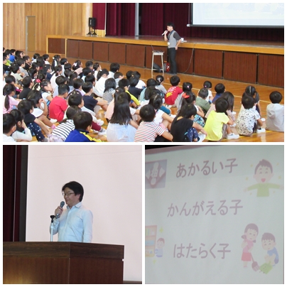 校長先生の話、校歌斉唱に続いて、生徒指導担当から心に響く話がありました。ラグビーワールドカップで日本文化を尊重したり、ボランティア活動に参加したりする選手団の姿から、「まずは身近なところから自分にできることを見つけてみよう」と語りかけました。子どもたちが、どんなすばらしい姿を見せてくれるか楽しみです。