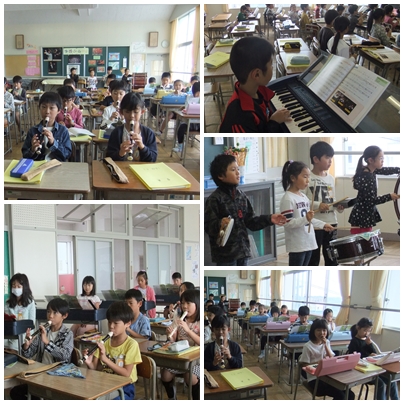 音楽の授業では、「聖者の行進」を4つのパートに分かれて練習していました。リコーダー、鍵盤ハーモニカ、打楽器、低音パートの4つです。休み時間にも音楽室へ行き、練習する子もいました。そして今日は、3年4組の子どもたちが発表してくれました。パートごとに、何度も何度も練習した成果が、合奏に表れていました。初めての合奏、どうだったかな?
