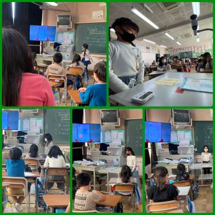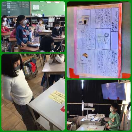 生活科で行った町たんけんで作った新聞の発表会を行いました。自分の行っていない場所の発表では、たくさん質問をして、身近な町についてより詳しくなりましたね。発表を聞いて気になった場所に、また行けるといいですね。