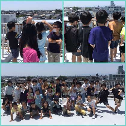 3組は、社会科「学校の周りのようす」の学習で、屋上から学校のまわりの様子を一望しました。初めて屋上に行ったので子供達はとても嬉しそうでした。最後に集合写真を撮りました。