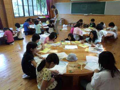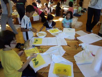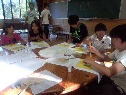 和紙に自然素材を貼っているところです。慎重に作っています。