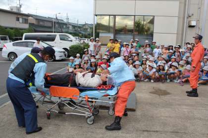厳しい日差しの中、消防本部を目指して朝から一生懸命歩いて行きました。到着して消防車や救急車を見ると、一気に皆目を輝かせました。
