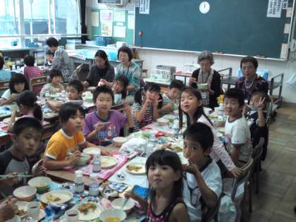 ふれあい遊びの会の後は、各学級で給食を一緒に食べていただきました。