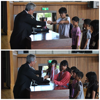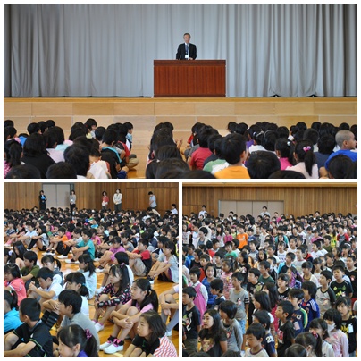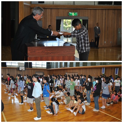 始業式の後、昨日行われた扶桑町民体育祭で活躍した子ども会のリレーの表彰と、後期通学班班長の認証式も行われました。