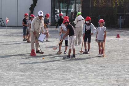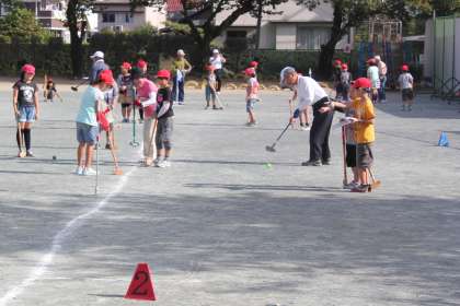 扶桑町グランドゴルフ協会の方々が、運動場にグランドゴルフのコースを設定してくださり、4年生がグランドゴルフを楽しみました。4年生の子どもたちは、地域の方々の丁寧な指導でどんどん上達し、とても楽しそうに体験をしていました。