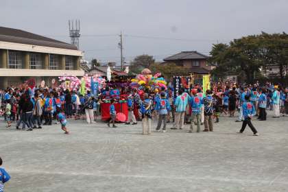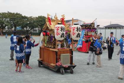 柏森の秋祭りがあり、運動場に柏森区の山車や神輿が勢ぞろいしました。かつぎ手やおはやしの演奏者として活躍する柏っ子の頼もしい姿が見られました。