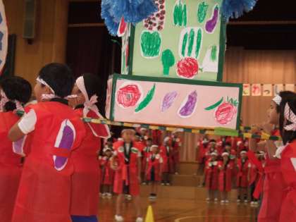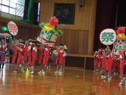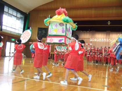 〈ねり歩き〉「ワッショイ!ワッショイ!」大きな声をかけながら、みこしやししまいのねり歩きをしました。