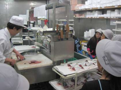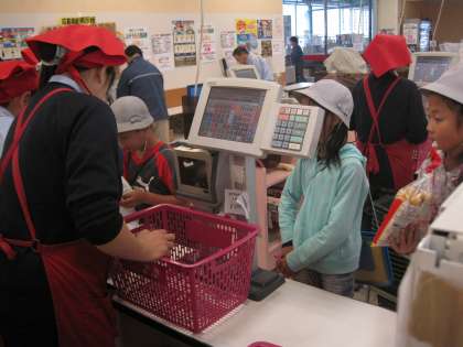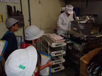 作業場を見せていただき、魚をさばいているところや肉をスライスしているところなど見学しました。普段見ることができない場所なので、子どもたちは楽しそうに勉強していました。最後に、お家の人に頼まれた商品を買い物させていただきました。